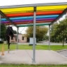 Stahlträger mit Buntglasdach; darunter Holzkreuz.